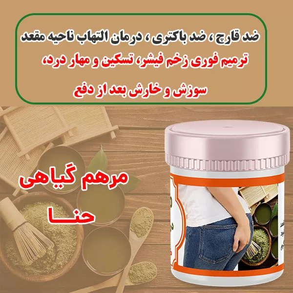 مرهم گیاهی حنا یک فرآورده موضعی ترکیبی برای کمک به کاهش علائم هموروئید و شقاق مقعدی است. این مرهم بر پایه ترکیب عصاره حنا و کورکومین (ماده مؤثره زردچوبه) همراه با روغنهای طبیعی تهیه شده است. هدف اصلی آن کنترل التهاب، کاهش درد و کمک به ترمیم بافت آسیبدیده ناحیه مقعد است.
